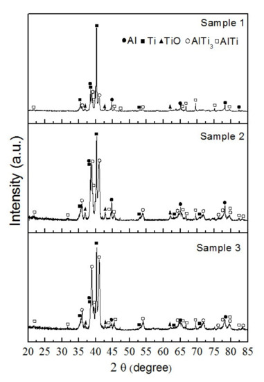 Figure 7 shows the XRD patterns of the Ti–Al powders obtained. The diffraction peaks indicate that the samples contain both intermetallic phases (TiAl, Ti3Al) and pure aluminum and titanium phases. As the energy introduced increases from E = 147 J (Sample 1) to E = 430 J (Sample 3), the content of TiAl and Ti3Al in the samples increases. In this case, the aluminum content in the wire dispersion products is 40.5 at.%, the titanium content is 59.5 at.%. In accordance with the aluminum–titanium phase diagram [30], α-Ti in alloys with a high aluminum content (39–46.5 at.%) decomposes into a mixture of Ti3Al and TiAl. Probably, the metal melt is initially formed during the passage of high-power current pulse in the aluminum and titanium wires, with the content of components corresponding to that in the wires. On cooling the melt, Ti3Al and TiAl phases are formed.