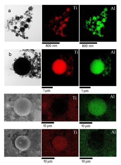 Figure 8. Titanium and aluminum distribution in particles (Sample 1): (а) nanoparticles, (b) submicron particles, (c,d) microparticles.