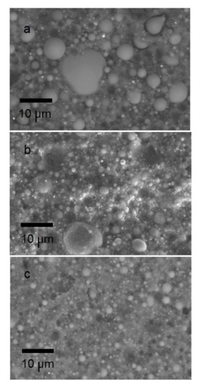 Figure 9. SEM images of the powder–polymer feedstock fracture surfaces: (a) feedstock 1, (b) feedstock 2, (c) feedstock 3.