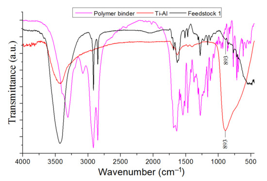 Ti–Al powders are prone to oxidation. Therefore, the synthesized powders are stored and processed in an inert atmosphere. FTIR spectra were used to determine the presence of titanium and aluminum oxides in the powder–polymer feedstock. Figure 10 shows comparative FTIR spectra of Ti–Al powder (sample 1) stored in air (red line), MC2162 polymer binder (pink line) and bimodal feedstock 1 (black line).