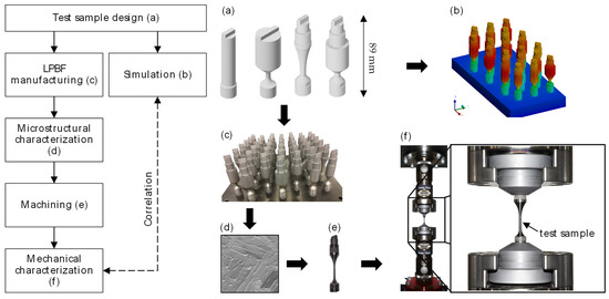 To determine the geometry effect on the material properties, initially, suitable sample geometries were developed, which should provide different thermal histories based on their differences in cross-sectional areas (a). The samples were then manufactured by LPBF (c) and microstructural investigations were performed on selected ones (d). Samples were machined into test shapes (e) to determine mechanical properties with static and dynamic mechanical testing (f). The LPBF process of the experimentally investigated sample geometries was simulated (b) to generate numerical parameters that were correlated with the mechanical properties to provide the basis for a predictive model.