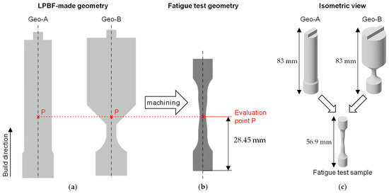 Methodology for local evaluation of geometry effect on microstructure and fatigue strength at evaluation point P, (a) LPBF-made geometry Geo-A and Geo-B, (b) Uniform fatigue test geometry after machining of Geo-A and Geo-B, (c) Isometric view of sample designs in LPBF-made condition and after machining in fatigue test geometry.
