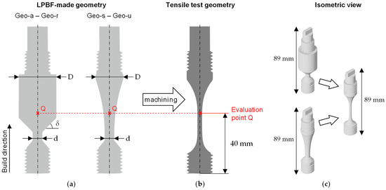 As displayed in Figure 3a, Geo-a–Geo-r are characterized by a narrow section with small diameter d, followed by a faster increasing cross-sectional area than Geo-s–Geo-u, to provoke an increased thermal input. All LPBF-made samples were machined into a uniform tensile test geometry (Figure 3b). The sample cross section was smallest at the evaluation point Q to test the local microstructure in the tensile test at this specific point.