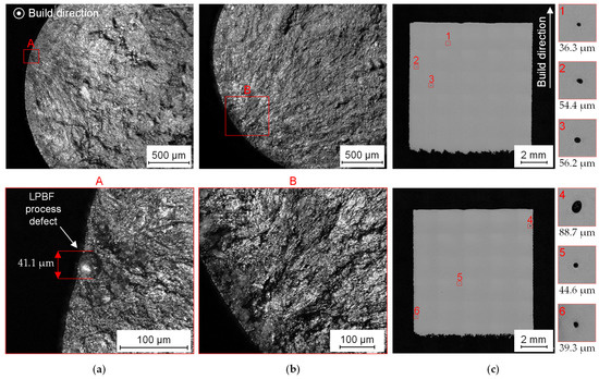 Fracture surface of two fatigue samples with crack initiation (a) at a gas pore as an LPBF process defect with detail view in A and (b) at solid material with detail view in B; Microscopical image of cross section of 10 mm × 10 mm × 10 mm cubic samples for optical density evaluation with indicated dimensions of six characteristic pores (1–6) in detail views (c).