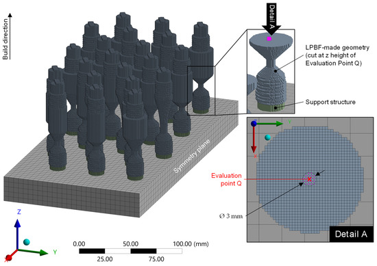 Transient thermal LPBF process simulations of the tensile test samples build job (Geo-a–Geo-u) were performed with Ansys Workbench Additive 2020 R2 (ANSYS Inc, Canonsburg, PA, USA) using the super layer approach. In this process, element layers with a multiple thickness of the real layer thickness (super layers) are built up on top of each other according to the element-birth method. All elements of the super layer are initially at melting temperature immediately after formation and are cooled in a defined number of substeps before applying the next layer according to the inter layer time, which is defined by the scanning duration and the duration of the recoating process. The build job shown in Figure 5 was simulated as a half model by taking symmetry of the build job layout into account. A hex mesh with SOLID70 elements of size 0.6 mm, corresponding to 10 times the layer thickness, and five substeps per simulated super layer were used. Recoating time was set to 8.39 s according to experimental measurement. The platform temperature was set to 90 °C, which is the measured mean value in the layer range around the evaluation point Q at build time between 8000 and 10,300 s. To correlate simulation results with experimental results from tensile test, nodal solutions of temperature over build time were extracted from the cut plane at z-height of Evaluation Point Q that fit in a circle of diameter 3 mm (Figure 5–Detail A) representing the force-loaded cross section in the tensile test.