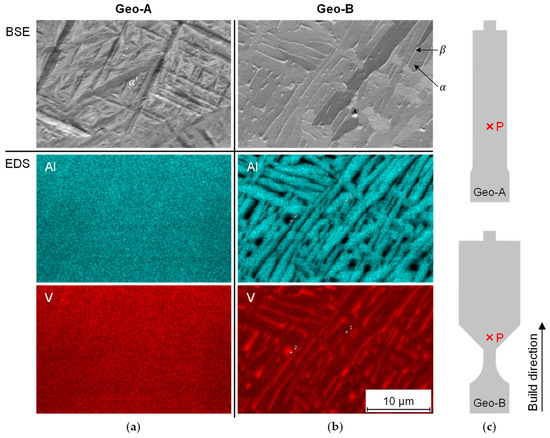 Figure 6a,b show the microstructure of samples Geo-A and Geo-B at evaluation point P. For Geo-A, the martensitic phase is recognizable that is common for LPBF-manufactured Ti-6Al-4V in as built condition (Figure 6a). Geo-B, on the other hand, shows a microstructure with lamellae embedded in a matrix (Figure 6b). The EDS mapping confirms this finding because the lamellae show an increased Al content, indicating the phase. The matrix shows increased vanadium concentration, which is characteristic for phase. It is noted that an effect of the sample geometry exists that leads to significantly different microstructure evolution at the examination point P.