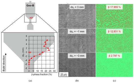 Since a geometry-related difference in microstructure was found, the region vertically adjacent to point P was analyzed for Geo-B that is characterized by an unsteady cross section course (Figure 7a). Figure 7b shows exemplary SEM images of the microstructure at different vertical distances to point P . Phase fractions were determined from the BSE images by use of Weka segmentation (Figure 7c). At a vertical distance to point P of matrix appears initially by a phase fraction of 2.797% (Figure 7c red). With progressing build job and increasing geometrical cross-section, fraction continues to increase until it reaches a maximum of 23.716% at . From this height, the increased beta fraction remains approximately constant with increasing height and levels off at about 20%. At a height of a clearly formed lamellar + microstructure is observed. The results show that a completely different microstructure can exist in LPBF-made parts of Ti-6Al-4V in only 5 mm difference in build height. Only influenced by the sample geometry, a change from an almost martensitic microstructure to a lamellar microstructure occurred. The observed microstructure in geometric areas not exposed to increased thermal input from heat accumulation or intrinsic heat treatment are in agreement with various studies, e.g., [4,13,21,22,23,24].
