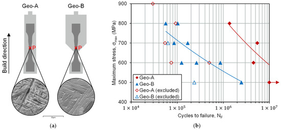 Geometry effect on fatigue life based on geometry variants Geo-A and Geo-B, (a) Geo-A and Geo-B with corresponding microstructure at evaluation point P, (b) Fatigue life of Geo-A and Geo-B, R = 0.1, samples with crack initiation at pore defects excluded (unfilled data points).