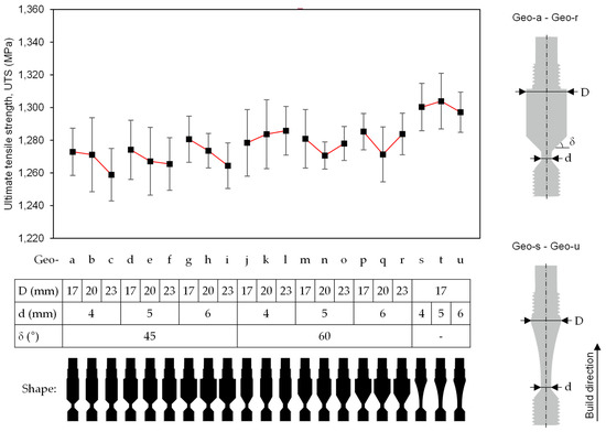 Ultimate tensile strength of geometry variants Geo-a–Geo-u with associated shape (black) and geometrical parameters indicated on the right.