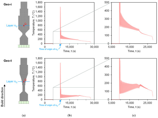 (a) Exemplary geometry variants Geo-i and Geo-t with evaluation point Q in corresponding layer nQ, (b) Time-temperature profile (thermal history) at Q with time of origin of marked layer nQ, (c) enlarged section of the thermal history at Q.
