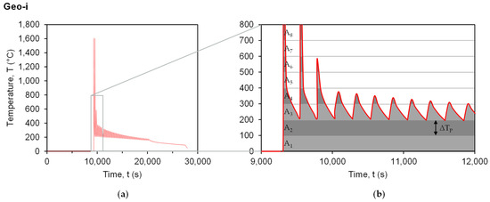 (a) Thermal history of Geo-i at evaluation point Q, (b) enlarged section of the thermal history with area under the time temperature curve subdivided into partitions A1–A8 of width = 100 °C.