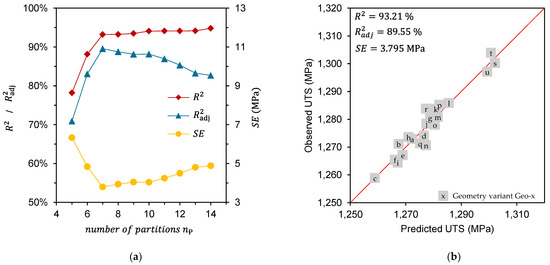 (a) Coefficient of determination , adjusted coefficient of determination and standard error depending on the number of considered partitions in the regression , (b) Prediction accuracy of the correlation model based on Equation (3) with geometry variants Geo-a–Geo-u.
