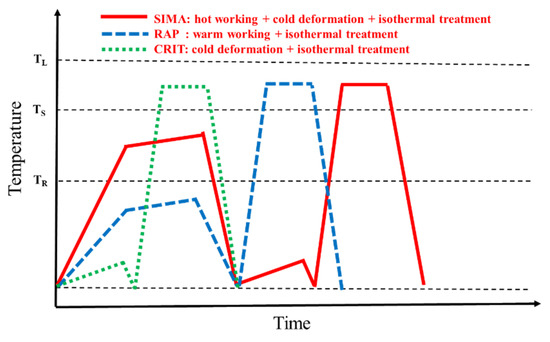 As shown in Figure 2, the traditional SIMA method was first proposed by Young [21] in 1983. The cast alloy is deformed by hot working processing at the recrystallization temperature and then cooled to room temperature for cold deformation processing. Finally, the deformed billet is heated to the semi-solid temperature range for isothermal processing to obtain the semi-solid billet. Hot working processing above recrystallization temperature improves grain anisotropy in as-cast microstructure, and cold deformation processing at room temperature stores deformation energy and provides energy for grain spheroidization during isothermal treatment. Compared with the liquid phase method, the traditional SIMA method is short in process, simple in operation, and does not require large complex equipment, so scholars have widely studied it in China and abroad. However, the SIMA method requires multi-pass pre-deformation treatment at different temperatures, which includes many processes and is not suitable for preparing large-size billets, so it needs further improvement. In 1992, the RAP method (Recrystallization and Remelting) was put forward demand by Kirkwood [22], the technique is improved based on the SIMA method. As shown in Figure 2, in the RAP method, “warm working” under the recrystallization temperature instead of “hot working + cold deformation processing” considerably shortened the preparation process of semi-solid billet, thus improving production efficiency.