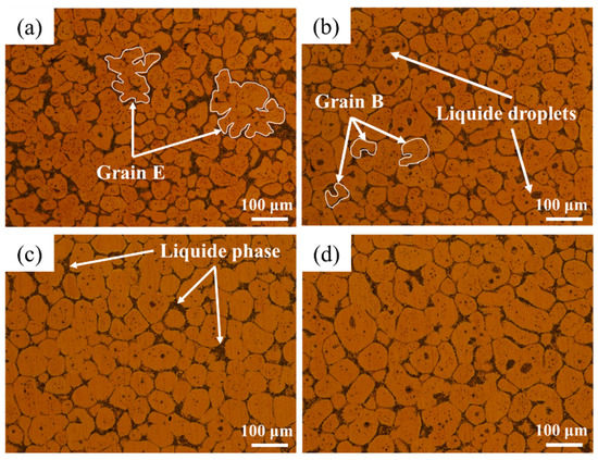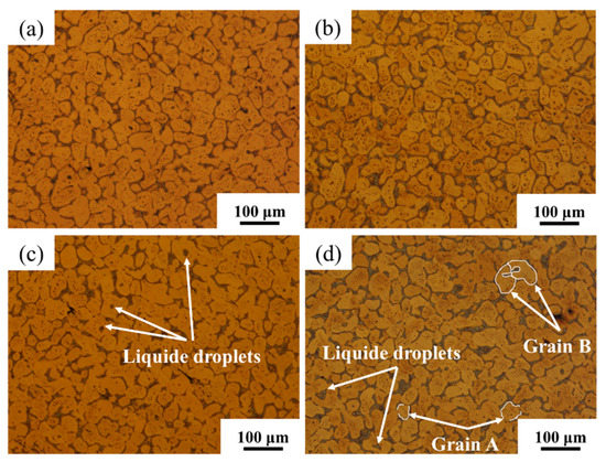 Figure 3 shows the microstructure evolution of semi-solid billet at 900 °C for 10 min under different cold rolling reductions. As shown in the figure, at 900 °C for 10 min, due to the short isothermal time, the low melting point eutectoid (α + δ + Cu3P) in the microstructure melted to form a small amount of liquid. The liquid could not aggregate and separate grains, so grain spheroidization is not obvious. Most grains in the microstructure bonded to each other, resulting in large grain diameter and poor roundness. The stored energy in the alloy increases with the increase of cold rolling reduction. In the same isothermal treatment process, the stored energy is released. Thus, the liquid in the microstructure increases. As shown in grain A in Figure 3d, the increase and aggregation of the liquid phase separated the grains, the grain was gradually refined, and its roundness improved. Figure 3a–3d observed liquid droplets in the solid phase grains. The liquid droplets slowly grew with the increase of cold rolling reduction and aggregated with the intergranular liquid to cut the grains, forming “C” shaped grains (grains B in Figure 3d).