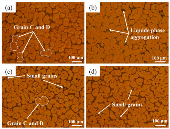 Figure 4 shows the microstructure evolution of semi-solid billet at 900 °C for 15 min under different cold rolling reductions. As shown in the figure, after 15 min isothermal at 900 °C, the effect of grain spheroidization was significantly improved, and most grains were spherical. However, the grains were still bonded to each other and were not evenly separated. The evolution behavior of grains can be roughly observed from Figure 4a. First, in the isothermal process, many small liquid droplets melted from the solid phase, then small liquid droplets aggregated to form large droplets. The intergranular liquid penetrated the grain, and the large liquid droplets migrated to the grain interface. They converged to reduce interfacial energy, thus forming C-shaped grains (grains B in the figure). Finally, the liquid formed by aggregation gradually cut the original grain and separated the fine, rounded spherical grain (grain A in the figure). The liquid phase segregation was observed with the increase of cold rolling reduction. A large amount of stored energy could not be easily released at high temperatures for short periods. Part of the stored energy was used for melting low melting point eutectoid into intergranular liquid, and part of the stored energy was used for the consolidation and growth of grains (grains C and D in the figure). The inhomogeneous distribution of solid and liquid phases was formed by merging and squeezing the intergranular liquid phase. Very fine burr grains were observed at the liquid phase aggregation and grain boundary. With the increase of cold rolling reduction, the shape of the burr grains gradually changed from sawtooth to dendritic.