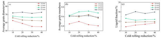 The average grain diameter, average grain roundness, and liquid fraction of the microstructure under different isothermal time and cold rolling reduction were quantitatively calculated, and the results are shown in Figure 7. As shown in Figure 7a, when the isothermal time is short (10–20 min), the increase of reduction can reduce the average grain diameter and achieve the effect of grain refinement. When the isothermal time is too long (25 min) and the amount of deformation is large (40%), the stored energy is fully released. The grain growth rate is faster in the isothermal process, and the average grain diameter increases. During the isothermal process, the average grain diameter increases gradually with the extension of isothermal time. As shown from Figure 7b, when the isothermal time is 10 min, the average grain roundness is less than the reference value (less than 0.5). When the isothermal time is 15–25 min, average grain roundness is relatively high when the cold rolling reduction is 10% or 40%, and relatively small when the cold rolling reduction is 20% or 30%. With the increase of isothermal time, average grain roundness increases first and then decreases. Excessive isothermal time will lead to severe grain coarsening, resulting in irregular grain shape and reduced average grain roundness. Figure 7c shows that the liquid fraction has little difference under different cold rolling reductions. With the prolongation of isothermal time, the liquid fraction increases gradually. At the same isothermal temperature (900 °C), the average grain diameter, average grain roundness, and liquid fraction of semi-solid billets were compared under four kinds of cold rolling reduction. It can be seen that when the reduction is 30% and isothermal time is 20 min, the average grain diameter of the semi-solid billet is lower, the average grain roundness is the largest, and the liquid fractions are suitable, which are 66.45 μm, 0.71, and 12.78%, respectively. Therefore, under the conditions of 30% cold rolling reduction and 20 min isothermal time, the semi-solid CuSn10P1 copper alloy billet prepared by the CRITSIMA method can produce a better semi-solid billet.