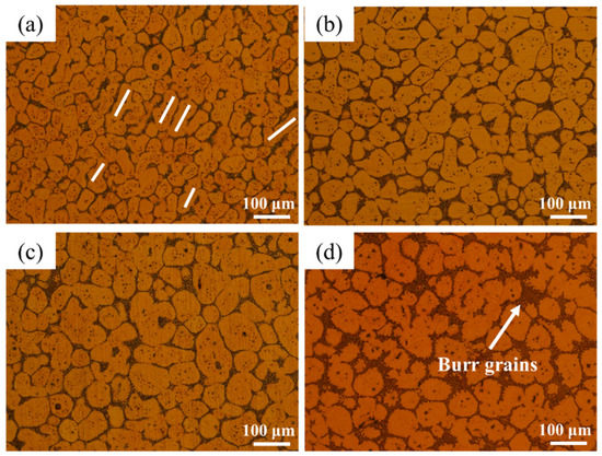 Figure 6 shows the microstructure evolution of semi-solid billet at 900 °C for 25 min under different cold rolling reductions. As shown in the figure, after 25 min isothermal time at 900 °C, the liquid phase in the microstructure increased significantly, and a large number of serrated burr grains appeared on the grain boundary. Excessive isothermal time makes the grain melting mechanism dominant, and the liquid phase inhibits grain growth. Compared with 20 min, the liquid fraction increased significantly at 25 min. It can be seen that longer isothermal time is not conducive to the preparation of semi-solid billets. Figure 6d shows that many burr grains were generated in the liquid. They are either distributed along grain boundaries in jagged shapes or distributed in the liquid phase in rose shapes and aggregate and grow into secondary dendrite arms. This phenomenon is consistent with the burr grain phenomenon observed in the study of semi-solid AlSi7Mg alloy billet by Jiang et al. [27], which may be caused by the exfoliation of high-energy sub-grains near the grain boundary by liquid infiltration.