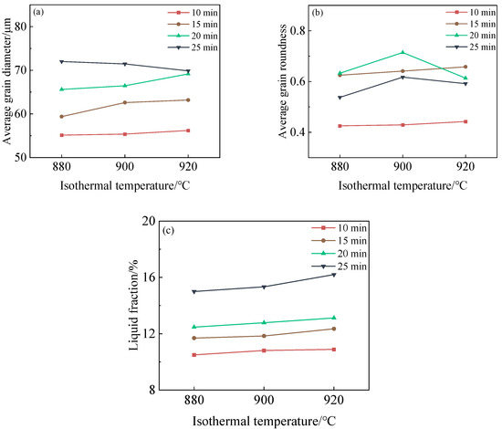 Microstructure relationship of semi-solid billet during isothermal treatment: (a) average grain diameter; (b) average grain roundness; (c) liquid fraction.