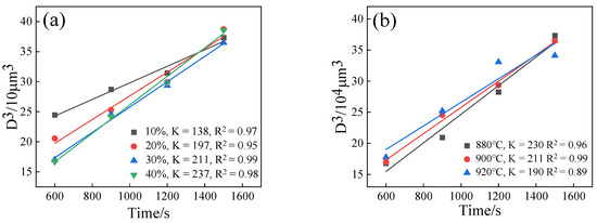 Grains begin to form semi-solid spherical grains at isothermal temperature for 10 min. The average grain diameter at 10 min of each cold rolling reduction was taken as the initial grain diameter D0. Origin software was used to calculate and linearly fit the cubic value of grain diameter at each deformation amount and isothermal time, and the grain coarsening rate coefficient at different isothermal temperatures was obtained, as shown in Figure 12. The adjusted goodness of fit R2 is 0.89–0.99, indicating that the fitting curve can reflect the coarsening rule of average grain diameter with isothermal time.