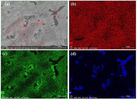 Figure 13 shows SEM and EDS surface scanning images of as-cast CuSn10P1 copper alloy without isothermal treatment with a cold rolling reduction of 30%. Dendrite fracture can be seen in Figure 13a. The distribution of elements can be seen by EDS surface scanning images in Figure 13b–d. Cu is the matrix distributed in the whole region, but there is a higher content in the dendrite (the position of point 1). Sn is less distributed in the dendrite, concentrated in the bright field region of the secondary phase (the position of point 2), and P is concentrated in the dark field region of the secondary phase (the position of point 4). There is severe element segregation in the secondary phase of as-cast microstructure.