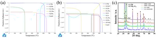 The PandatTM software was used to calculate the fraction of phases in solidification, as shown in Figure 1a,b. The Mg–6Al–Mn alloy is mainly composed of α-Mg and β-Mg17Al12 phases, and also contains small amounts of Al–Mn, Al–Ca, and Al–Mg–Y phases. However, because of the limited content of Al–Mn, Al–Mg–Y, and Al–Ca, no peaks of intermetallic compounds are found in Figure 1c, as shown in a similar study [].