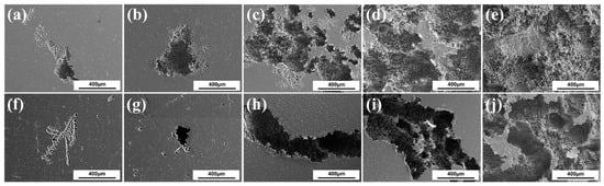 The surface morphologies of the two GCed alloys after removing corrosion products for different immersion times, are shown in Figure 3. In the case of the GC AM60 alloy (see Figure 3a–e), corrosion begins as pitting, then the pitting micro-craters expand, increasing their expansion surface and depth as the holding time increases to 12 h. Finally, pitting connected with each other and severe corrosion appears on the entire surface after 1 week. The corrosion behavior of the GCed AMXW6000 alloy is similar to the AM60 alloy, as illustrated in Figure 3f–j. For instance, the initial pitting turns into filiform corrosion after 12 h, forming a deep corrosion valley. As the corrosion continues, the corrosion valley begins to spread, and eventually, a large area of corroded surface can be seen in the GC AMXW6000 alloy. This result is consistent with previous reports of corrosion of Mg alloys []. In addition, by comparing the corroded surface of two alloys at the same immersion time, it can be found that addition of Ca and Y under GC can effectively improve the corrosion resistance of AMXW6000. Previous results reported that the addition amount of Ca and Y should be below a critical value which plays an important role in slowing down corrosion rates [].