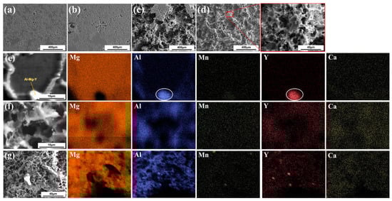 By comparing the EDS mapping in terms of corrosion time of the HPDCed AMXW6000 alloy in Figure 5e–g, the Ca distributes in a more uniform way, while Y forms a Mg–Al–Y phase and tends to gather. With more deepening of the corrosion degree, the α-Mg phase gradually corrodes away, and β-Mg17Al12, Al–Mn, Mg–Al–Y, and other phases with higher corrosion potential are hard to corrode, but remain on the surface, as shown in Figure 5g.