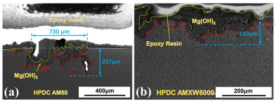 Figure 6 shows the cross-section SEM images of HPDCed alloys immersed in 3.5 wt% NaCl solution for 4 days. The HPDCed AM60 alloy has a large uncorroded area that is clearly isolated from the corroded area (“unaffected surface”—dot-line in white). The HPDCed AMXW6000 alloy is more susceptible to corrosion than AM60 and most of the surface is covered by corrosion products (“corroded surface”—dot-line in yellow). Corrosion spreads and stops in the direction of the thickness and this area is labeled with a red dotted line (“affected surface”). The maximum corrosion depth and width of the pitting corrosion of the HPDCed AM60 alloy are 257 μm and 730 μm, respectively, as shown in Figure 6a. Figure 6b shows the lateral corrosion morphology of HPDCed AMXW6000 alloy with a maximum corrosion depth of 115 μm; the corrosion occurs in almost the whole surface. Under HPDCed conditions, the AM60 alloy tends to corrode more locally, while the AMXW6000 alloy tends to corrode more extensively, but to a shallow depth.