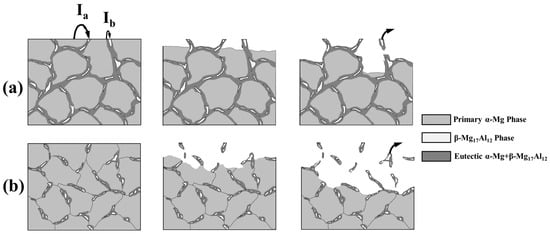 Usually, there are two mechanisms for β-Mg17Al12 phase related to corrosion in Mg alloys. One is the mechanism of forming a micro-galvanic corrosion to accelerate the corrosion of the α-Mg phase. The α-Mg phase potential is lower than that of the β-Mg17Al12 phase, and the β-Mg17Al12 phase tends to form a micro-galvanic corrosion with the α-Mg phase, leading to the accelerated corrosion of the magnesium substrate. The other is the mechanism of corrosion protection. The β-Mg17Al12 phase is easy to gather at GBs during casting. If the β phase forms a network-like structure, it is not easy for the remaining β phase to undergo further corrosion after the α-Mg phase has been corroded. Thus, it can protect the magnesium alloy []. However, if the β-Mg17Al12 phase does not form a perfect grid (see GC samples in Figure 2) when the α-Mg matrix corroded, the corrosion will further extend to the interior part resulting in the β-Mg17Al12 phase being dropped off. According to the above results and analysis, the corrosion mechanisms of both HPDC and GC are shown in Figure 7a,b, respectively. Generally, the first phase to be corroded is the α-phase, micro-currents will be generated between different phases due to the potential difference []. Additionally, the β phases as corrosion obstructers depend on the network forming, as well as grain size.