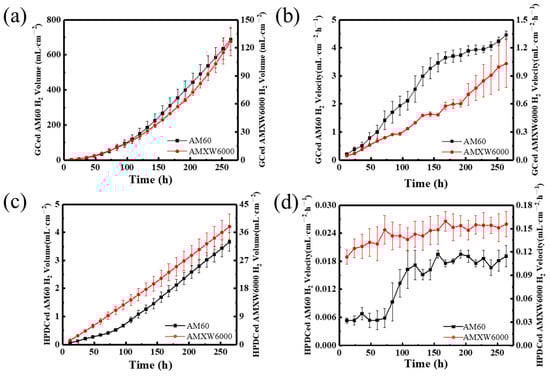 H2 release volume (a,c) and calculated evolution rate (b,d) of AM60 and AMXW6000 alloy in terms of time in GC and HPDC state, respectively.