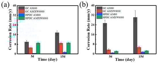 Corrosion rate examined by weight loss tests of GC and HPDC samples: (a) IT and (b) SST results, respectively.