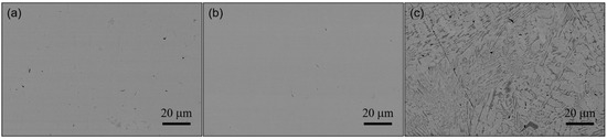 Figure 1 shows the SEM images with the back-scattered electron (BSE) of Cr5, Mo5, and Si5 HEAs. It can be seen from Figure 1a,b that with the addition of Cr and Mo, the Cr5 and Mo5 HEAs display a single solid solution phase. The BSE microstructure shown in Figure 1c indicates that there is a large number of dark phases (DPs) appearing in the solid solution matrix of the Si5 HEA. These DPs present a needle-like sharp eutectic HEAs [44] structure with BCC + DP and a mesh-shape distribution in the matrix, suggesting that the addition of Si promotes the formation of an ordered silicide phase [41,45]. This structure guarantees that this alloy has an excellent casting property.