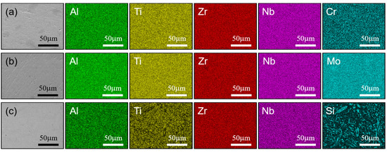The EDS mapping of the Al15Zr40Ti28Nb12M5(Cr, Mo, Si) HEAs is displayed in Figure 2. As can been seen from Figure 2a,b, the distribution of each element is still uniform in the Cr5 and Mo5 HEAs alloys. However, with the addition of Si, a large number of Si-rich precipitates appeared in the matrix. In addition, these precipitates are poor in Ti, as shown in Figure 2c, and the Al, Zr, and Nb display uniform distributions.