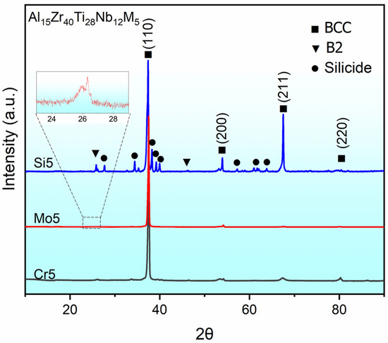 The XRD patterns of the Al15Zr40Ti28Nb12M5(Cr, Mo, Si) HEAs are shown in Figure 3. It can be seen that the main phase of these alloys is a BCC solid solution structure. A small amount of B2 structure appears with the addition of Cr and Mo. A large amount of silicide appears in the Si5 HEA with the addition of Si, which exhibits DP in Figure 1c. The peak at 26° in the XRD patterns of these HEAs indicates that some ordered B2 phases have been formed in these alloys [44,46], and there is also a peak with illustration enlargement with the pattern of the Mo5 alloy. According to the reported Al10 (Al10(Zr50Ti35Nb15)90) [15] and Zr50Ti35Nb15 [42] alloy, the ordered B2 phase indicates that the Cr, Mo, Si, and Al can promote the formation of an ordered BCC structure in the Zr-Ti-Nb-based alloys.