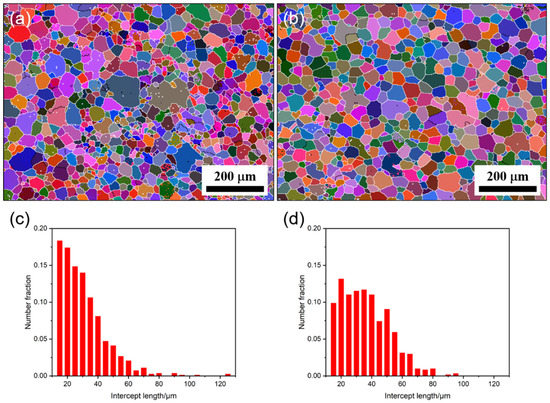 The EBSD images with all Euler angles and the grain size obtained by the EBSD technique of these HEAs, (a,b) the EBSD images with all Euler angles of Cr5 and Mo5 HEAs, (c,d) the grain size of the Cr5 and the Mo5 HEAs.