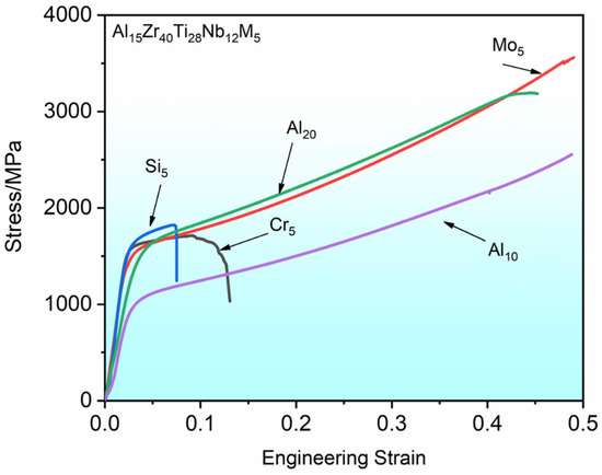 Compressed stress–strain curves of the Al15Zr40Ti28Nb12M5(Cr, Mo, Si) HEAs and Alx(Zr50Ti35Nb15)100−x [15] HEAs (reproduced from Ref. [15], with permission from Elsevier, 2022).