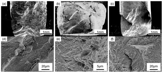 The SEM images of the samples after the compression test and the fracture surface of the Al15Zr40Ti28Nb12M5(Cr, Mo, Si) HEAs are shown in Figure 6. Figure 6a–c show the compressed sample morphologies of the Cr5, Mo5 and Si5 HEAs, respectively. It can be found that the alloys exhibit obvious brittle fracture with the addition of Cr and Si. However, the sample of the Mo5 HEA is not completely damaged, with only cracks and slip lines appearing on the sample surface. The fracture-surface images of the Cr5 HEAs are shown in Figure 6d. There are many cleavages planes and river patterns on the fracture surface, indicating that the alloy exhibits significant cleavage fracture. The fracture-surface image of the Mo5 alloy is presented in Figure 6b,e. It can be seen that there are many slip lines and dimples on the surface of the sample and fracture surface, leading to ductile fracture of the Mo5 alloy. The fracture-surface image of Si5 alloy is exhibited in Figure 6f. The river pattern and needle-sheet structure in the fracture suggest that brittle breakage occurs during the progress of compression.