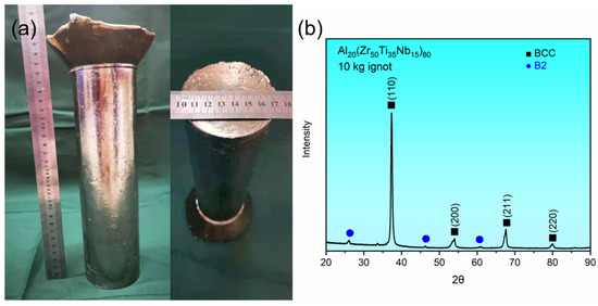 (a) The 10 kg ingot of Al20(Zr50Ti35Nb15)80 alloy, (b) the XRD pattern of the ingot.