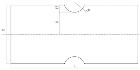 As shown in Figure 2, it is a plate with two side notches; the parameters B, b, H, R, and L are the total width, net width, notch depth, notch radius, and length of the plate, respectively, and the influence of the plate thickness is not considered. The notch depth, H, and notch radius, R, are the main parameters controlling the notch shape in practical application. A large amount of literature has shown that the notch radius, R, has an important effect on the stress field; this parameter is not discussed here. In addition, parameters B and b both denote the width of the plate, and they have a linear correlation. It should also be noted that the notch depth, H, is the geometric parameter that controls the shape of the notch; the net width, b, is the geometric parameter that controls the shape of the structure; and they are independent parameters. In summary, in this paper, we explore the effects of b, H, and L on the stress field near the notch.