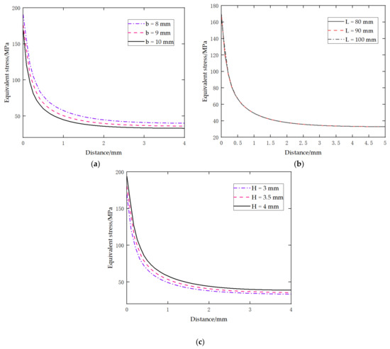Considering the constraints and test conditions, finite element simulation is used to obtain the stress–distance curve on a specified path near the notch, and then the effect of changes in b, H, and L on the stress is analyzed. The stress mentioned above is equivalent stress, also known as von Mises stress. This value is defined by the fourth strength theory and comprehensively considers the influence of the first, second, and third principal stresses. The results are shown in Figure 3.
