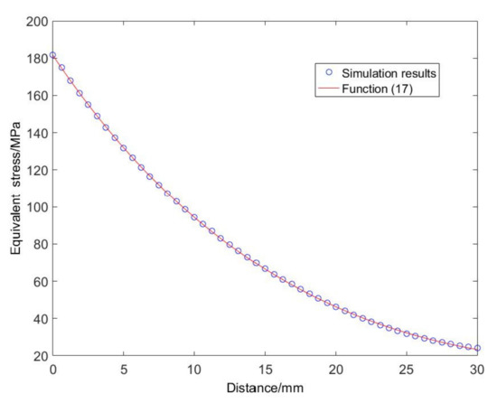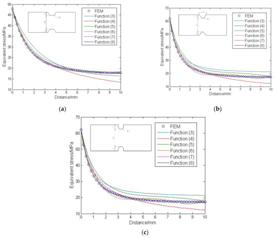 To verify the effectiveness and applicability of the new function, semicircular notch, V-notch, and U-notch, which are commonly used in practical engineering, are selected for verification. The length, height, and thickness of the three notched plates are the same, and the notch shape is different. The stress field on the specified path of each notch is first simulated by ANSYS software (American ANSYS, Pittsburgh, PA, USA). Then, the simulated data are fitted with the help of MATLAB (MATLAB R2014a, MathWorks, Natick, MA, USA) using Functions (3)~(8), as shown in Figure 4.