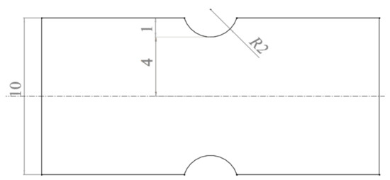 Based on the new stress Function (8) and the modified critical distance Equation (11), the fatigue strength of a notched component with regular shape is predicted. The selected notched component model is shown in Figure 5, and the dimensions are in mm.