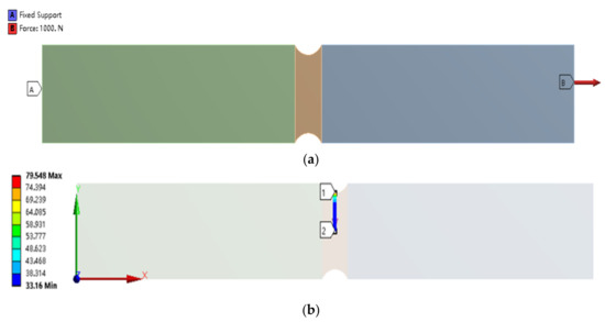 Finite element simulation of the above component with a semicircular notch is carried out with the help of ANSYS (American ANSYS, Pittsburgh, PA, USA). First, the finite element model of the component with a semicircular notch is established. Then, the mesh is divided, and loads and constraints are applied. To improve the simulation efficiency, when dividing the mesh, the mesh size of the area close to the notch is smaller, set to 0.2 mm. The mesh size of the part far from the notch can be larger, set to 1 mm. In addition, since the component is mainly subjected to tensile load and the magnitude of the load does not affect the analysis results, a fixed constraint is applied to the left end, and a 1000 N tensile load is applied to the right end, as shown in Figure 6a. Finally, the stresses on the path from the bottom, point 1 of the notch, to the middle, point 2 of the plate, are analyzed. The specified path is shown in Figure 6b.
