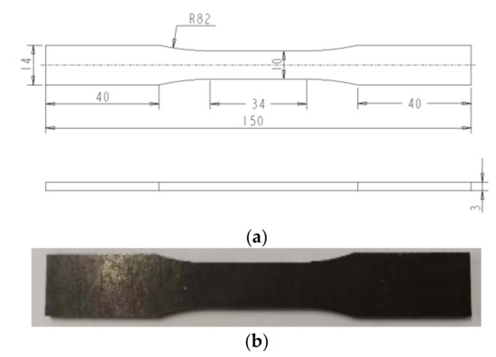 We adopt a rectangular section of the standard specimen, and its geometric dimensions are determined according to ISO 6892-1: 2009 [41]. The specimen dimensions and physical object are shown in Figure 7.
