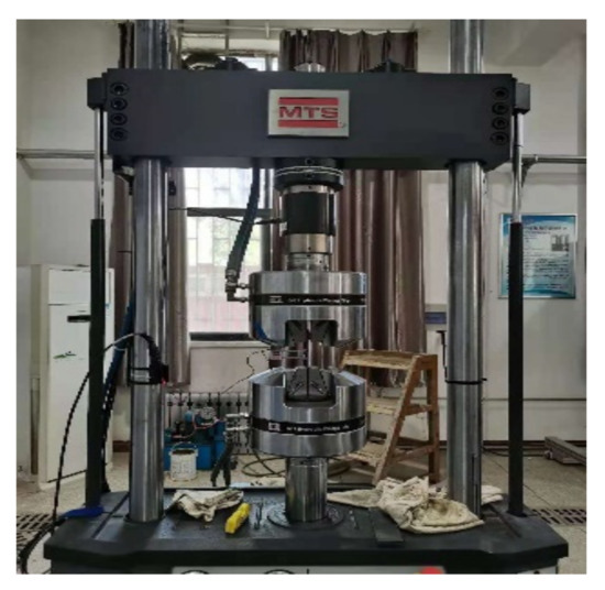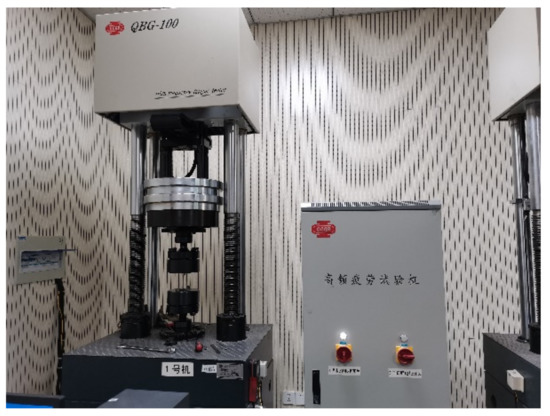 The fatigue test of the notched specimen was carried out on a QBG-100 (Changchun Qianbang Equipment Co., Ltd., Changchun, China) high-frequency fatigue testing machine. The test equipment is shown in Figure 12. The testing machine can carry out static and dynamic load tests. Its maximum load is 500 kN and the maximum loading frequency is 100 Hz. It is found that the number of specimens, stress level difference, and the number of stress levels have an impact on the test results of the up-and-down method [45]. To obtain a more reliable fatigue strength of the Q355 notched specimen, in this paper, the stress levels is controlled at 3~5, and about 16 specimens are selected for the test. At the same time, to avoid the influence of other factors on the test results, all specimens are tested under the same conditions.