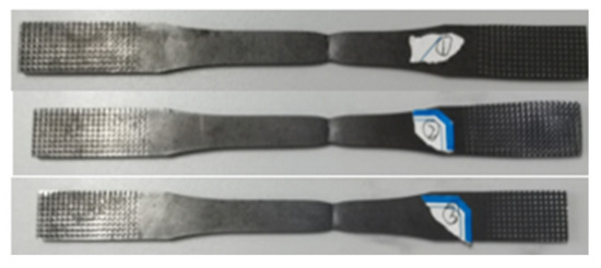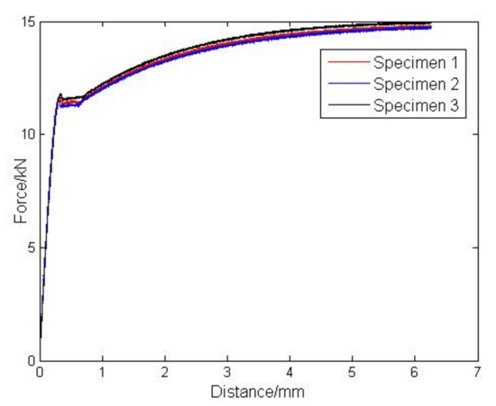 The tensile fracture of the three specimens is shown in Figure 9. After the test, the load and displacement data of each specimen are collected. The load–displacement curves of the three specimens are obtained according to these test data, and the results are shown in Figure 10. According to the measurement method of relevant parameters [42], the tensile strength, yield strength, and elastic modulus of the three specimens are measured separately from the load–displacement curves. The results are shown in Table 6.