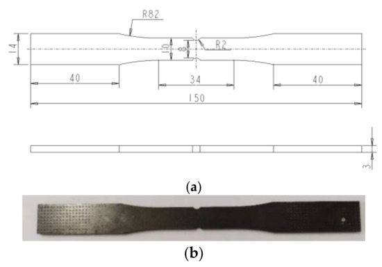 The geometric dimensions of the notched specimen are determined according to ISO 1099: 2017 [44]. The dimensions and physical object of the notched specimen are shown in Figure 11.