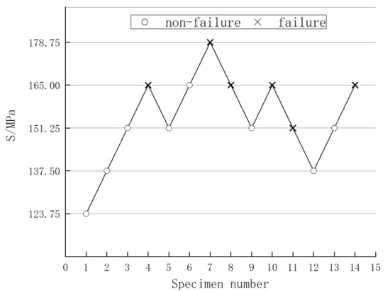 After the relevant parameters are determined, the fatigue test of the first specimen is carried out. The test is terminated when the specimen reaches the specified number of cycles or fatigue fracture occurs early. The stress level of the next specimen is determined from the result of the previous specimen. The test steps are the same as those of the first specimen, etc., until six pairs of valid data are collected. During the test, the stress level and the number of cycles of each specimen are recorded.