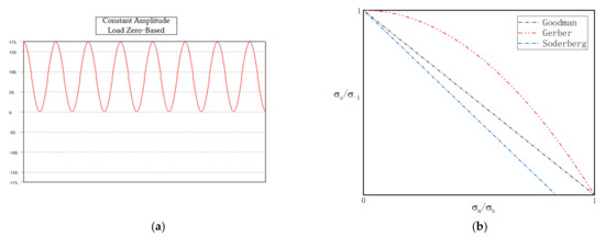 Sinusoidal load spectrum of the rotating arm: (a) sinusoidal load spectrum; (b) Goodman formula.