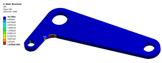 In the past, the nominal stress method was often used to analyze the fatigue life of turnover mechanisms. This method takes the nominal stress of the structure as the control parameter, and the analysis process is similar to that of TCD. By setting the nominal stress spectrum, the S–N curve, and the Goodman formula of the rotating arm, the fatigue life of the rotating arm is calculated to be 167,850 cycles, as shown in Figure 20.